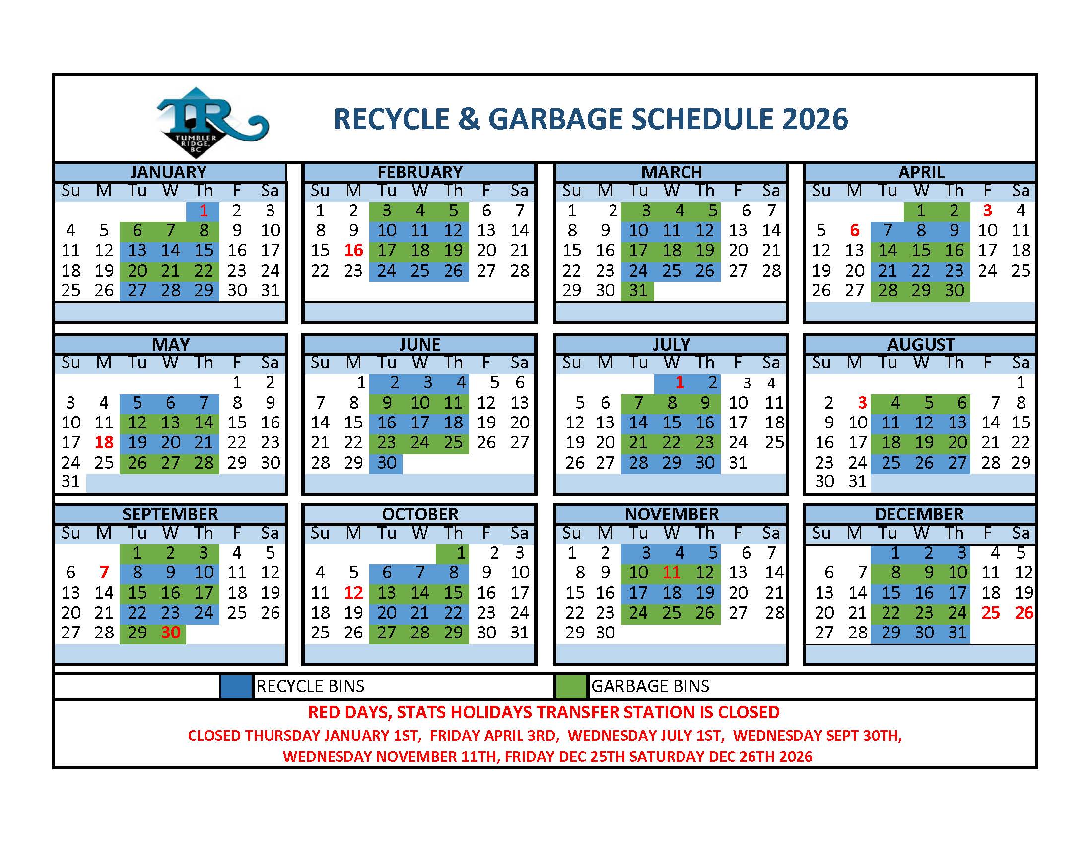 A waste transfer station located at 103 Ridge Road in Tumbler Ridge offers services to residents with items too large for curbside pick-up. There are specific areas for metal waste, wood, compost material and household waste.