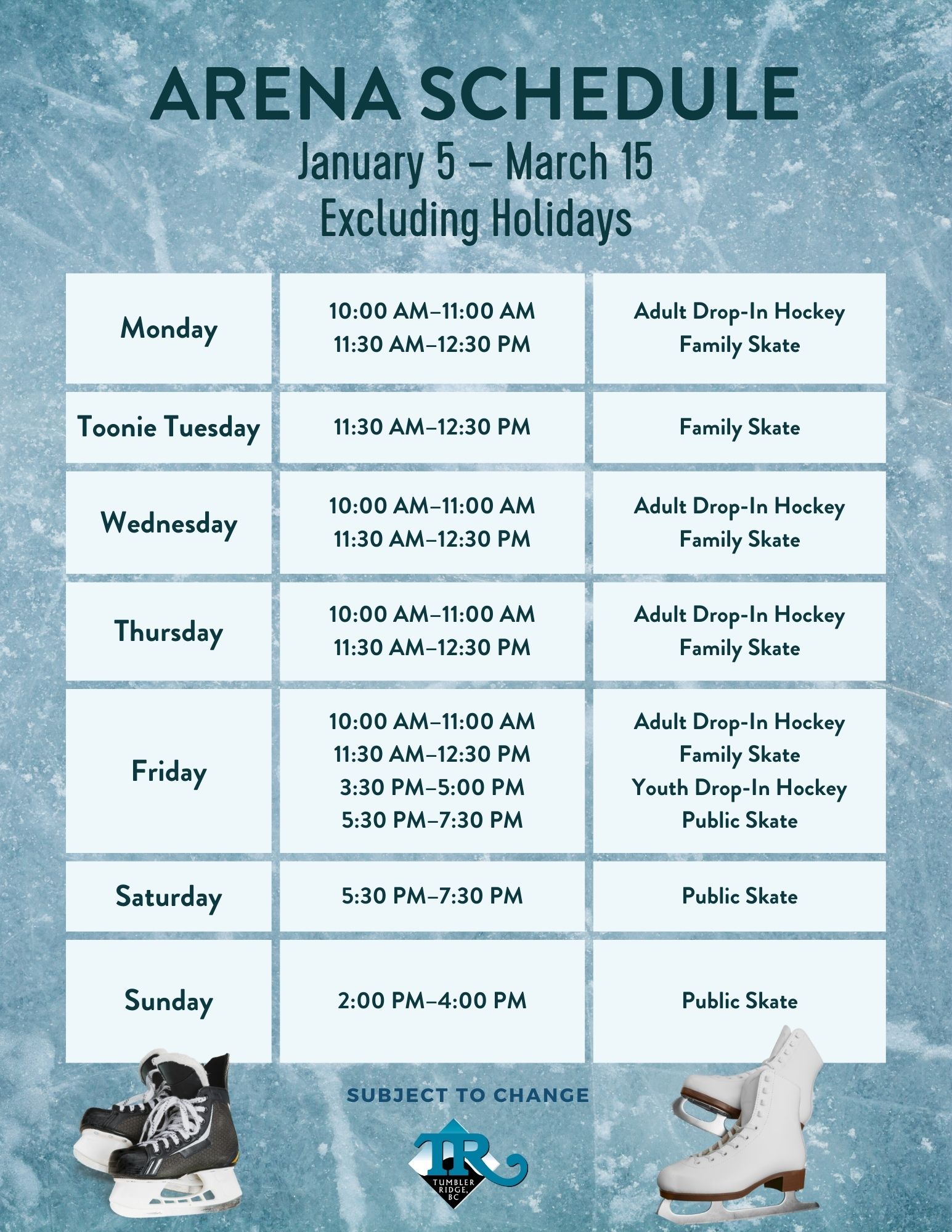 Our NHL sized (200 x 85 feet) arena hosts hockey games, tournaments, skating lessons, skating carnivals, special events, family skates, drop in hockey, and public skates. The arena is also available for private rentals all year round. The arena is equipped with a radiant-heated seating area for up to 750 spectators, and a skaters' lobby with an on-site concession that is open during hockey and skating events. Skate sharpening is available upon request and the Community Centre Front Desk.
