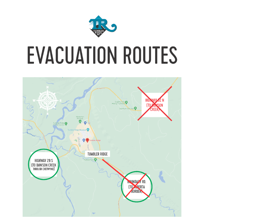 Evacuate via Highway 29 to Dawson Creek, through Chetwynd.