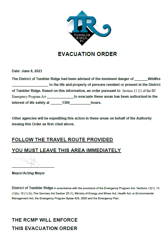 Evacuate immediately if you are in the District of Tumbler Ridge and east including Bearhole Lake.