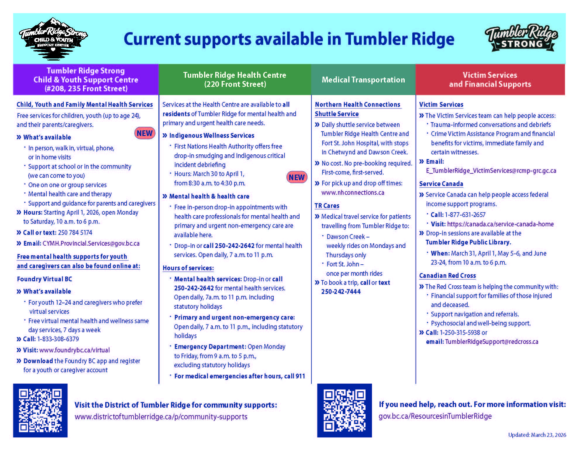 The government of British Columbia is working to ensure that every possible support is available to the community of Tumbler Ridge as it deals with the impacts of this tragedy. Please click here for their full resource list.